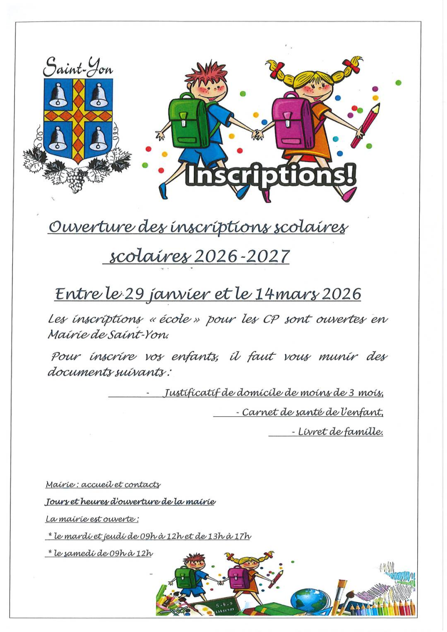 Les inscriptions « école » pour les CP sont ouvertes en Mairie de Saint-Yon. Pour inscrire vos enfants, il faut vous munir des documents suivants :